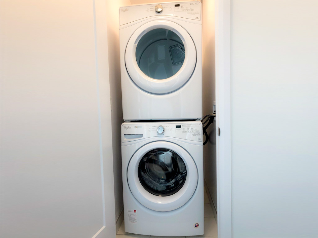 - Stacked, white front-loading dryer and front-loading high efficiency washer